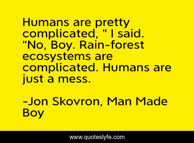 This page presents the quote "Humans are pretty complicated, ” I said. “No, Boy. Rain-forest ecosystems are complicated. Humans are just a mess.". Author of this quote is Jon Skovron, Man Made Boy. This quote is about mess, life, complicated-people, humans,.