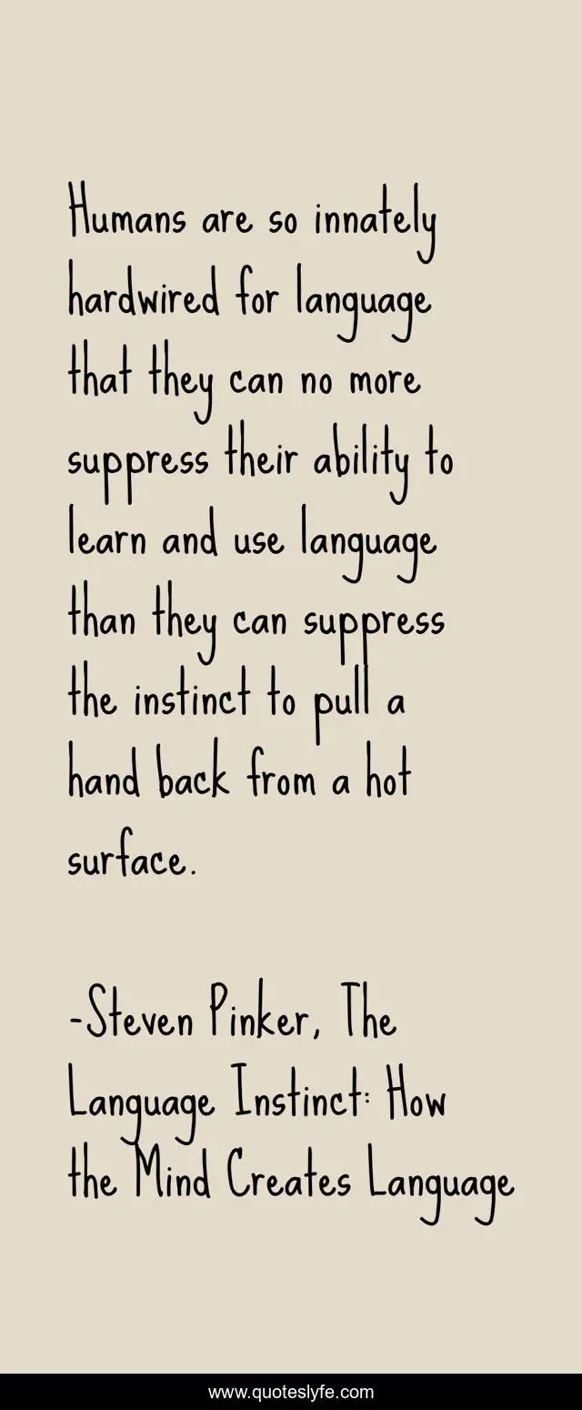 This page presents the quote "Humans are so innately hardwired for language that they can no more suppress their ability to learn and use language than they can suppress the instinct to pull a hand back from a hot surface.". Author of this quote is Steven Pinker, The Language Instinct: How the Mind Creates Language. This quote is about instinct, communication, language,.