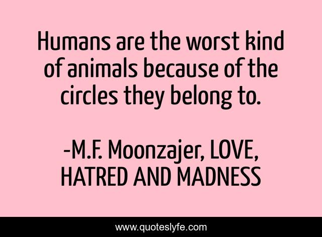 This page presents the quote "Humans are the worst kind of animals because of the circles they belong to.". Author of this quote is M.F. Moonzajer, LOVE, HATRED AND MADNESS. This quote is about circles, animals, humans, creatures,.