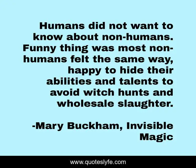 This page presents the quote "Humans did not want to know about non-humans. Funny thing was most non-humans felt the same way, happy to hide their abilities and talents to avoid witch hunts and wholesale slaughter.". Author of this quote is Mary Buckham, Invisible Magic. This quote is about magic, urban-fantasy, paranormal,.