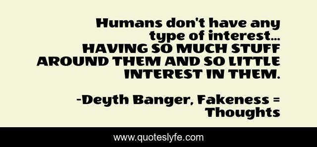 This page presents the quote "Humans don't have any type of interest... HAVING SO MUCH STUFF AROUND THEM AND SO LITTLE INTEREST IN THEM.". Author of this quote is Deyth Banger, Fakeness = Thoughts. This quote is about have, humans, dont, interest,.