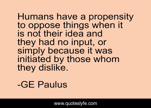 This page presents the quote "Humans have a propensity to oppose things when it is not their idea and they had no input, or simply because it was initiated by those whom they dislike.". Author of this quote is GE Paulus. .