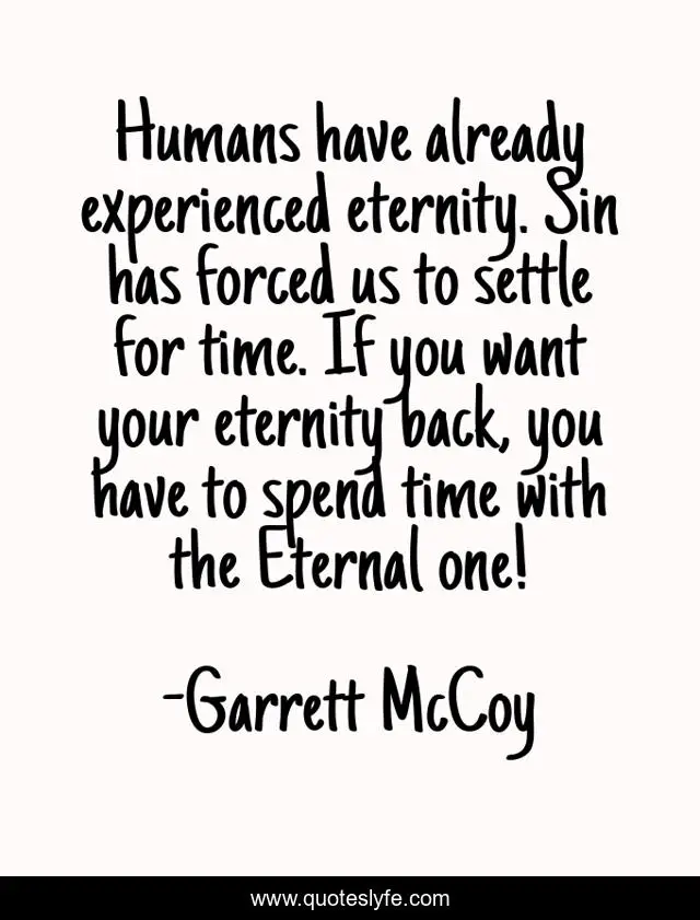This page presents the quote "Humans have already experienced eternity. Sin has forced us to settle for time. If you want your eternity back, you have to spend time with the Eternal one!". Author of this quote is Garrett McCoy. This quote is about eternity, god, spend, human, time,.