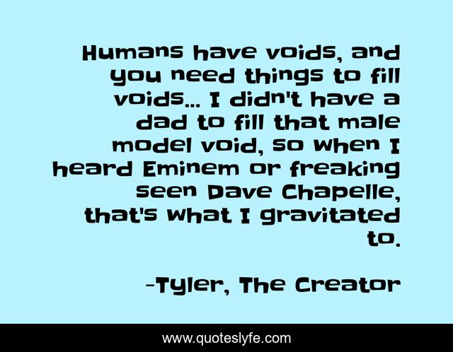 This page presents the quote "Humans have voids, and you need things to fill voids... I didn't have a dad to fill that male model void, so when I heard Eminem or freaking seen Dave Chapelle, that's what I gravitated to.". Author of this quote is Tyler, The Creator. This quote is about need, things,.