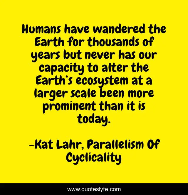 This page presents the quote "Humans have wandered the Earth for thousands of years but never has our capacity to alter the Earth’s ecosystem at a larger scale been more prominent than it is today.". Author of this quote is Kat Lahr, Parallelism Of Cyclicality. This quote is about anthropocene, ecosystem, humans, environment, earth, change,.