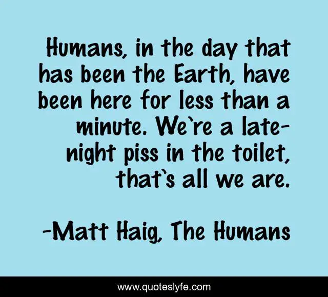 This page presents the quote "Humans, in the day that has been the Earth, have been here for less than a minute. We’re a late-night piss in the toilet, that’s all we are.". Author of this quote is Matt Haig, The Humans. .
