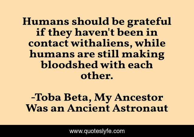 This page presents the quote "Humans should be grateful if they haven't been in contact withaliens, while humans are still making bloodshed with each other.". Author of this quote is Toba Beta, My Ancestor Was an Ancient Astronaut. This quote is about alien, encounter, human,.
