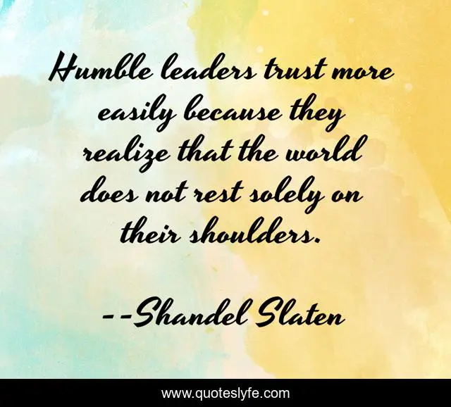 This page presents the quote "Humble leaders trust more easily because they realize that the world does not rest solely on their shoulders.". Author of this quote is -Shandel Slaten. This quote is about trust, leader, leadership, team,.