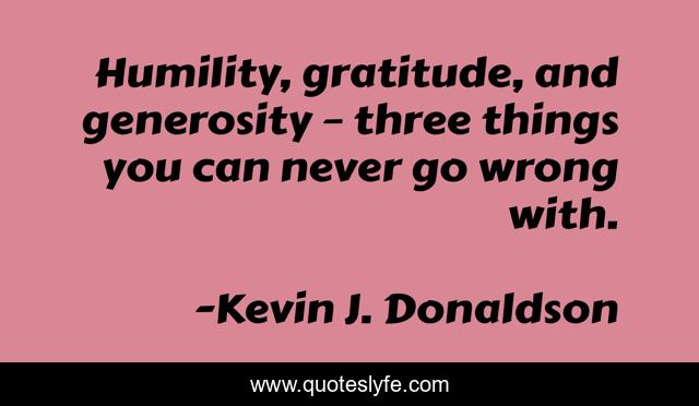 This page presents the quote "Humility, gratitude, and generosity – three things you can never go wrong with.". Author of this quote is Kevin J. Donaldson. This quote is about gratitude, generosity, success, humility,.