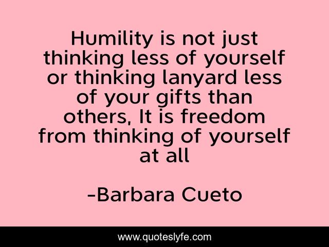 This page presents the quote "Humility is not just thinking less of yourself or thinking lanyard less of your gifts than others, It is freedom from thinking of yourself at all". Author of this quote is Barbara Cueto. .