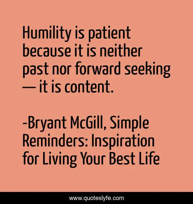 This page presents the quote "Humility is patient because it is neither past nor forward seeking — it is content.". Author of this quote is Bryant McGill, Simple Reminders: Inspiration for Living Your Best Life. This quote is about patience, humility, contentment, seeking,.