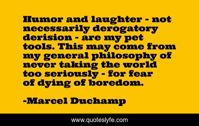 This page presents the quote "Humor and laughter - not necessarily derogatory derision - are my pet tools. This may come from my general philosophy of never taking the world too seriously - for fear of dying of boredom.". Author of this quote is Marcel Duchamp. This quote is about pet, fear, laughter,.