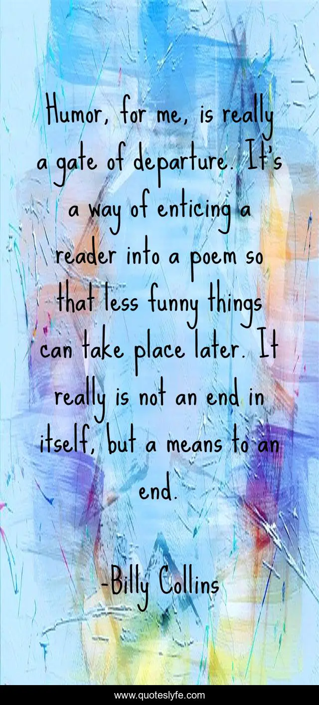 This page presents the quote "Humor, for me, is really a gate of departure. It's a way of enticing a reader into a poem so that less funny things can take place later. It really is not an end in itself, but a means to an end.". Author of this quote is Billy Collins. This quote is about me, funny, comedy, end,.
