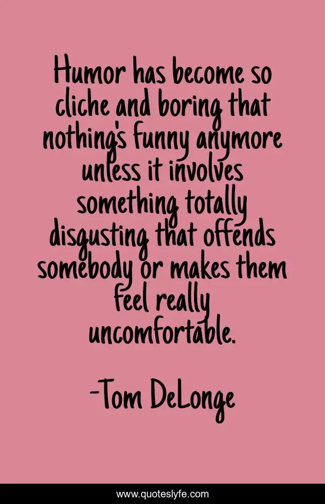This page presents the quote "Humor has become so cliche and boring that nothing's funny anymore unless it involves something totally disgusting that offends somebody or makes them feel really uncomfortable.". Author of this quote is Tom DeLonge. This quote is about nothing, funny, comedy, boring,.