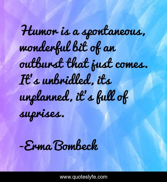 This page presents the quote "Humor is a spontaneous, wonderful bit of an outburst that just comes. It's unbridled, its unplanned, it's full of suprises.". Author of this quote is Erma Bombeck. This quote is about surprise, spontaneity, humor,.