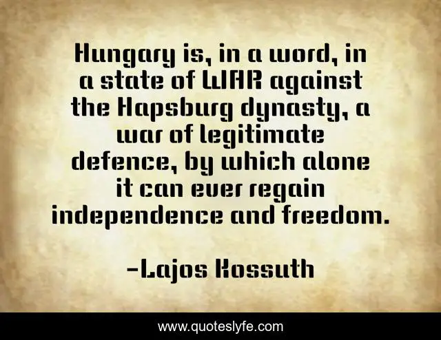 This page presents the quote "Hungary is, in a word, in a state of WAR against the Hapsburg dynasty, a war of legitimate defence, by which alone it can ever regain independence and freedom.". Author of this quote is Lajos Kossuth. This quote is about alone, freedom, independence,.