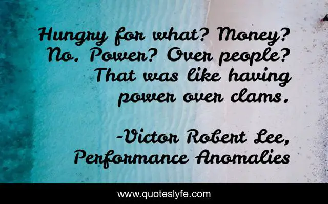 This page presents the quote "Hungry for what? Money? No. Power? Over people? That was like having power over clams.". Author of this quote is Victor Robert Lee, Performance Anomalies. This quote is about money, philosophy-of-life, cono, power, power-over-people,.