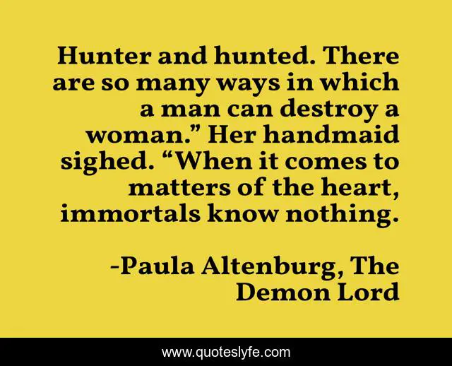 This page presents the quote "Hunter and hunted. There are so many ways in which a man can destroy a woman.” Her handmaid sighed. “When it comes to matters of the heart, immortals know nothing.". Author of this quote is Paula Altenburg, The Demon Lord. This quote is about fantasy-romance, dystopia, novella, western-romance, demons,.