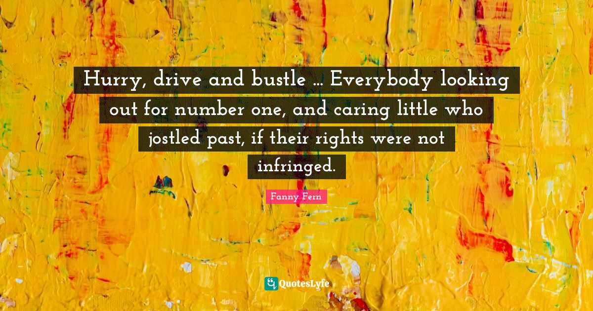 This page presents the quote "Hurry, drive and bustle ... Everybody looking out for number one, and caring little who jostled past, if their rights were not infringed.". Author of this quote is Fanny Fern. This quote is about bustle, caring, past, rights,.
