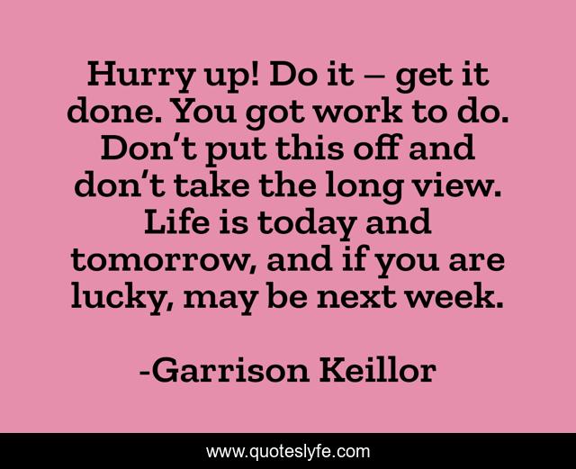 This page presents the quote "Hurry up! Do it – get it done. You got work to do. Don’t put this off and don’t take the long view. Life is today and tomorrow, and if you are lucky, may be next week.". Author of this quote is Garrison Keillor. This quote is about enthusiasm, creativity, inspirational, life-lessons,.