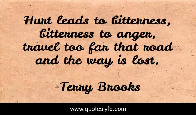 This page presents the quote "Hurt leads to bitterness, bitterness to anger, travel too far that road and the way is lost.". Author of this quote is Terry Brooks. This quote is about anger, road, hurt,.