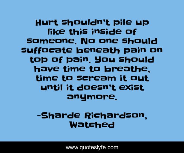 This page presents the quote "Hurt shouldn’t pile up like this inside of someone. No one should suffocate beneath pain on top of pain. You should have time to breathe, time to scream it out until it doesn’t exist anymore.". Author of this quote is Sharde Richardson, Watched. This quote is about hurting, hurt,.