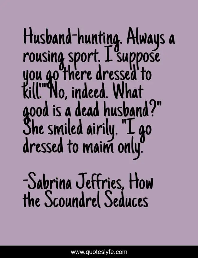 This page presents the quote "Husband-hunting. Always a rousing sport. I suppose you go there dressed to kill.""No, indeed. What good is a dead husband?" She smiled airily. "I go dressed to maim only.". Author of this quote is Sabrina Jeffries, How the Scoundrel Seduces. .