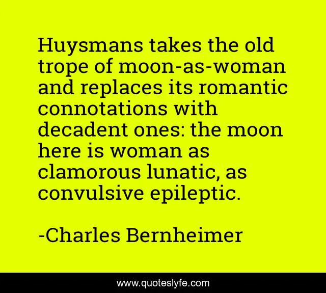 This page presents the quote "Huysmans takes the old trope of moon-as-woman and replaces its romantic connotations with decadent ones: the moon here is woman as clamorous lunatic, as convulsive epileptic.". Author of this quote is Charles Bernheimer. This quote is about joris-karl-huysmans, feminine, lunatic, moon,.