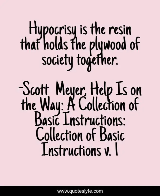 This page presents the quote "Hypocrisy is the resin that holds the plywood of society together.". Author of this quote is Scott Meyer, Help Is on the Way: A Collection of Basic Instructions: Collection of Basic Instructions v. 1. This quote is about society, humor, hypocrisy,.