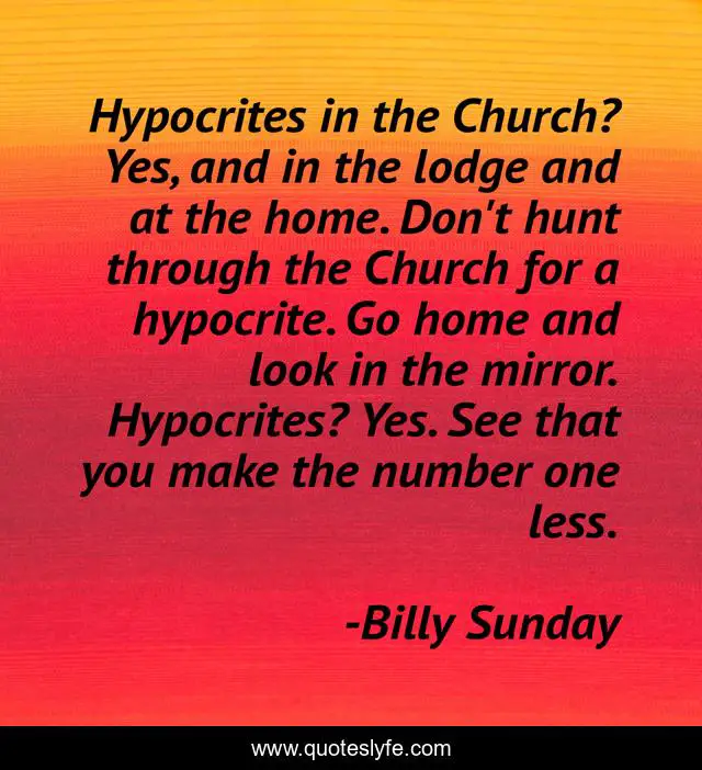 This page presents the quote "Hypocrites in the Church? Yes, and in the lodge and at the home. Don't hunt through the Church for a hypocrite. Go home and look in the mirror. Hypocrites? Yes. See that you make the number one less.". Author of this quote is Billy Sunday. This quote is about hypocrite, mirror,.