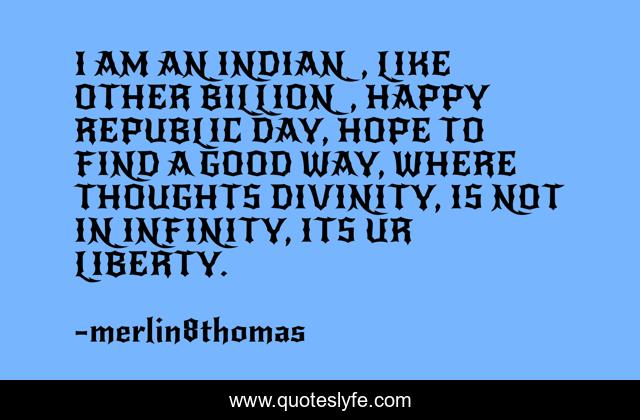 This page presents the quote "I AM AN INDIAN, LIKE OTHER BILLION, HAPPY REPUBLIC DAY, HOPE TO FIND A GOOD WAY, WHERE THOUGHTS DIVINITY, IS NOT IN INFINITY, ITS UR LIBERTY.". Author of this quote is merlin8thomas. This quote is about billion, republic, indian, infinity, liberty,.