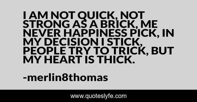 This page presents the quote "I AM NOT QUICK, NOT STRONG AS A BRICK, ME NEVER HAPPINESS PICK, IN MY DECISION I STICK, PEOPLE TRY TO TRICK, BUT MY HEART IS THICK.". Author of this quote is merlin8thomas. This quote is about heart, people, decision, quick, brick, strong, thick, happiness,.