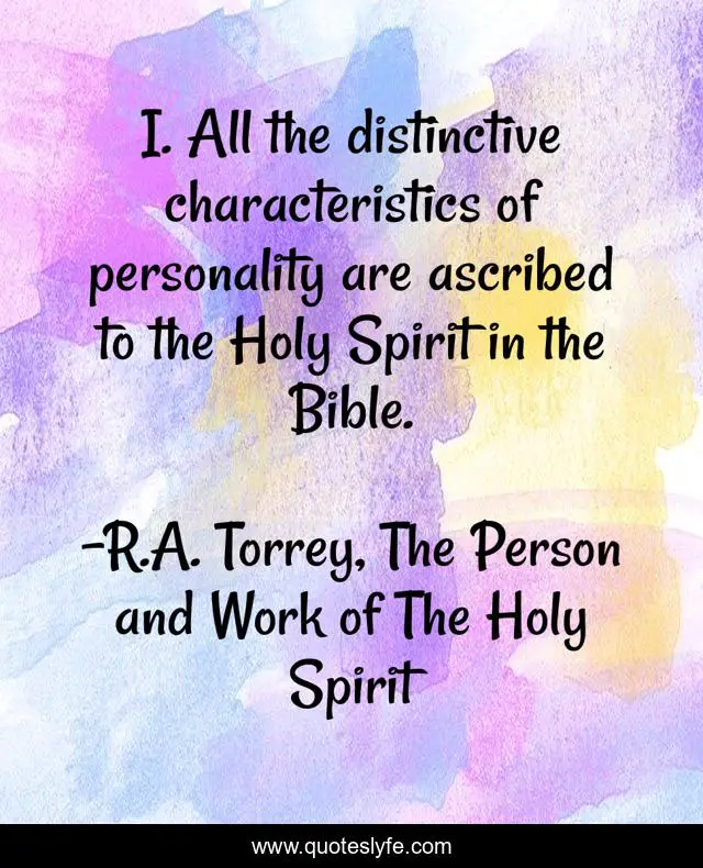 This page presents the quote "I. All the distinctive characteristics of personality are ascribed to the Holy Spirit in the Bible.". Author of this quote is R.A. Torrey, The Person and Work of The Holy Spirit. .