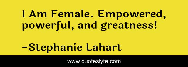 This page presents the quote "I Am Female. Empowered, powerful, and greatness!". Author of this quote is Stephanie Lahart. This quote is about empowering, inspiring, females, female, empowering-women, woman-power, girl-power, stephanie-lahart, empowering-girls,.