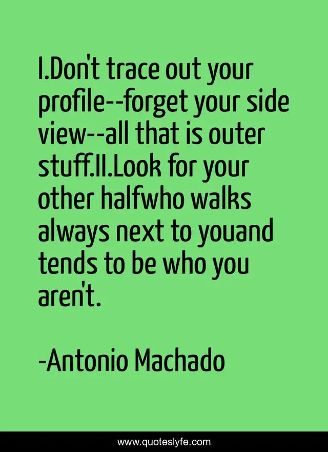 This page presents the quote "I.Don't trace out your profile--forget your side view--all that is outer stuff.II.Look for your other halfwho walks always next to youand tends to be who you aren't.". Author of this quote is Antonio Machado. .