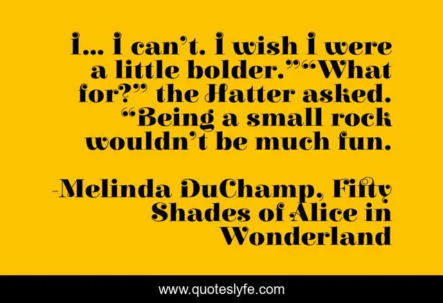 This page presents the quote "I… I can’t. I wish I were a little bolder.”“What for?” the Hatter asked. “Being a small rock wouldn’t be much fun.". Author of this quote is Melinda DuChamp, Fifty Shades of Alice in Wonderland. This quote is about funny, retellings, humor, romance, fantasy, erotic, pun-intended, erotica, comedy,.