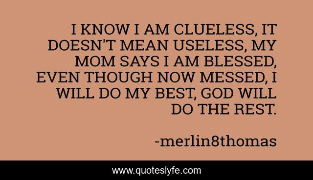 This page presents the quote "I KNOW I AM CLUELESS, IT DOESN'T MEAN USELESS, MY MOM SAYS I AM BLESSED, EVEN THOUGH NOW MESSED, I WILL DO MY BEST, GOD WILL DO THE REST.". Author of this quote is merlin8thomas. This quote is about messed, clueless, god, blessed, rest, useless, mom, best,.