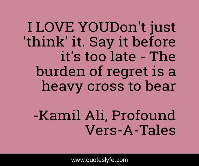 This page presents the quote "I LOVE YOUDon't just 'think' it. Say it before it's too late - The burden of regret is a heavy cross to bear". Author of this quote is Kamil Ali, Profound Vers-A-Tales. This quote is about kamiltheauthor, spawn, kamil, love, regret, ali, philosophy, cross, dawn-s,.