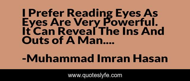 This page presents the quote "I Prefer Reading Eyes As Eyes Are Very Powerful. It Can Reveal The Ins And Outs of A Man....". Author of this quote is Muhammad Imran Hasan. This quote is about eyes, power-of-eye, life, soul, body-and-mind, truth, revealed, personality,.