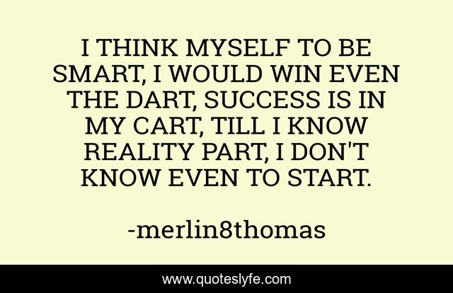 This page presents the quote "I THINK MYSELF TO BE SMART, I WOULD WIN EVEN THE DART, SUCCESS IS IN MY CART, TILL I KNOW REALITY PART, I DON'T KNOW EVEN TO START.". Author of this quote is merlin8thomas. This quote is about success, cart, dart, start, reality, smart,.
