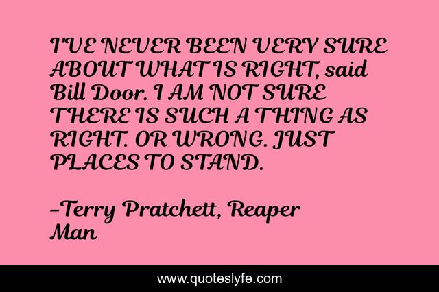 This page presents the quote "I'VE NEVER BEEN VERY SURE ABOUT WHAT IS RIGHT, said Bill Door. I AM NOT SURE THERE IS SUCH A THING AS RIGHT. OR WRONG. JUST PLACES TO STAND.". Author of this quote is Terry Pratchett, Reaper Man. This quote is about wrong, right,.