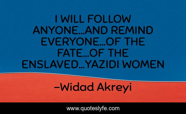 This page presents the quote "I WILL FOLLOW ANYONE...AND REMIND EVERYONE...OF THE FATE...OF THE ENSLAVED...YAZIDI WOMEN". Author of this quote is Widad Akreyi. This quote is about widad-akrawi, ezidis, christians, human-rights, violence-against-women, peace, yazidis, civil-society, defend-international,.