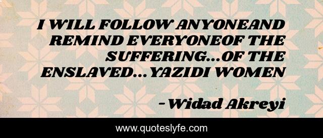 This page presents the quote "I WILL FOLLOW ANYONEAND REMIND EVERYONEOF THE SUFFERING...OF THE ENSLAVED...YAZIDI WOMEN". Author of this quote is Widad Akreyi. This quote is about widad-akrawi, christians, human-rights, violence-against-women, peace, yazidis, civil-society, defend-international, rape,.
