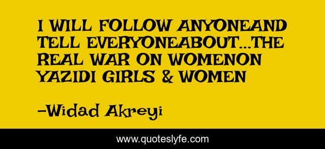 This page presents the quote "I WILL FOLLOW ANYONEAND TELL EVERYONEABOUT...THE REAL WAR ON WOMENON YAZIDI GIRLS & WOMEN". Author of this quote is Widad Akreyi. This quote is about widad-akrawi, human-rights, peace, kobane, yazidis, humanity, sadness, genocide, terror,.