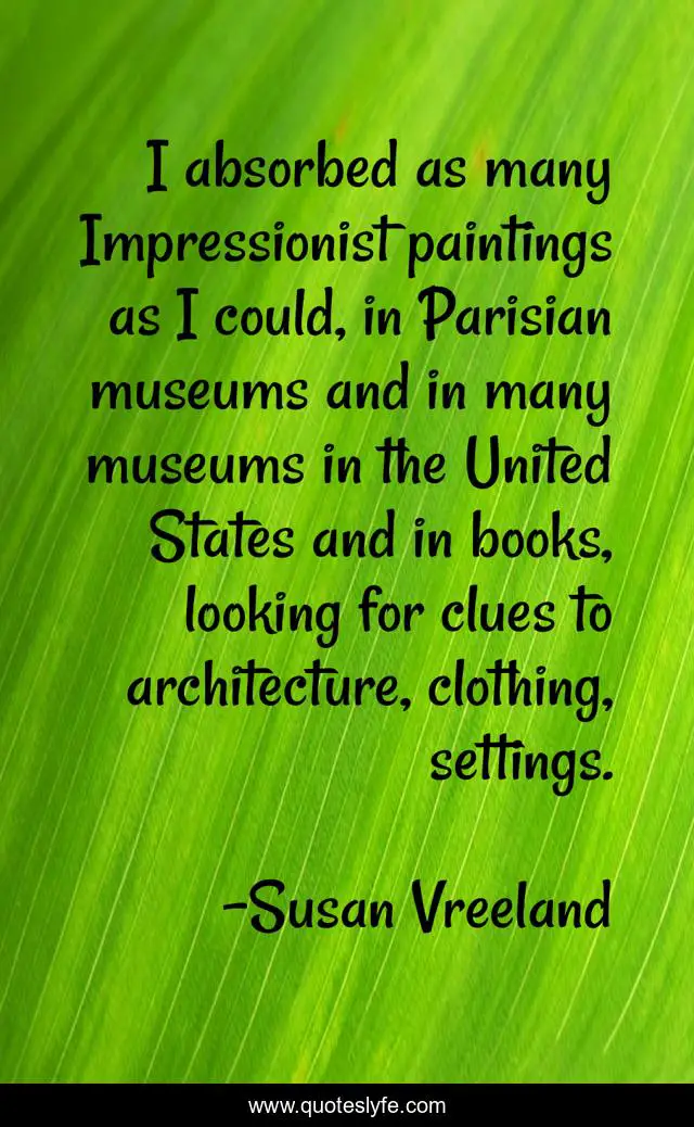 This page presents the quote "I absorbed as many Impressionist paintings as I could, in Parisian museums and in many museums in the United States and in books, looking for clues to architecture, clothing, settings.". Author of this quote is Susan Vreeland. This quote is about looking, museums, clothing,.