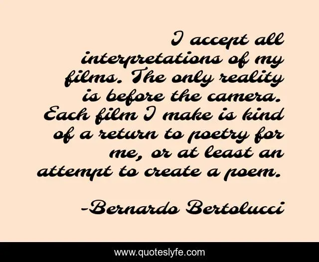 This page presents the quote "I accept all interpretations of my films. The only reality is before the camera. Each film I make is kind of a return to poetry for me, or at least an attempt to create a poem.". Author of this quote is Bernardo Bertolucci. This quote is about me, camera, reality,.