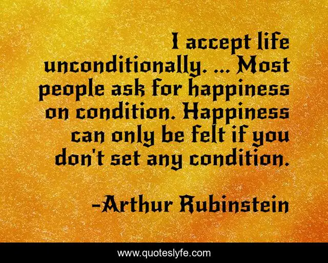 This page presents the quote "I accept life unconditionally. ... Most people ask for happiness on condition. Happiness can only be felt if you don't set any condition.". Author of this quote is Arthur Rubinstein. .