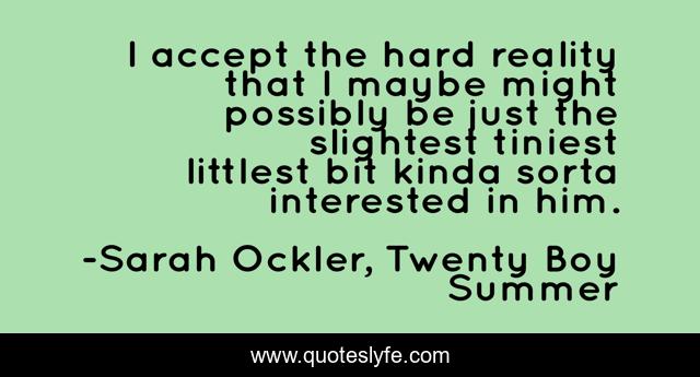 This page presents the quote "I accept the hard reality that I maybe might possibly be just the slightest tiniest littlest bit kinda sorta interested in him.". Author of this quote is Sarah Ockler, Twenty Boy Summer. .