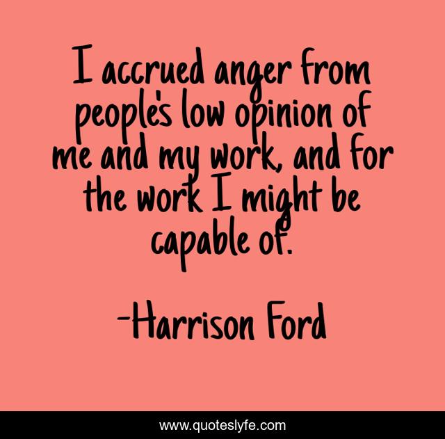 This page presents the quote "I accrued anger from people's low opinion of me and my work, and for the work I might be capable of.". Author of this quote is Harrison Ford. This quote is about me, work, people,.