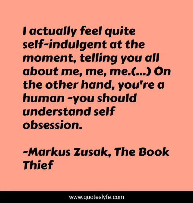This page presents the quote "I actually feel quite self-indulgent at the moment, telling you all about me, me, me.(...) On the other hand, you're a human -you should understand self obsession.". Author of this quote is Markus Zusak, The Book Thief. This quote is about irony, egocentrism, self-absorption, egocentricity, humanity, self-obsession,.